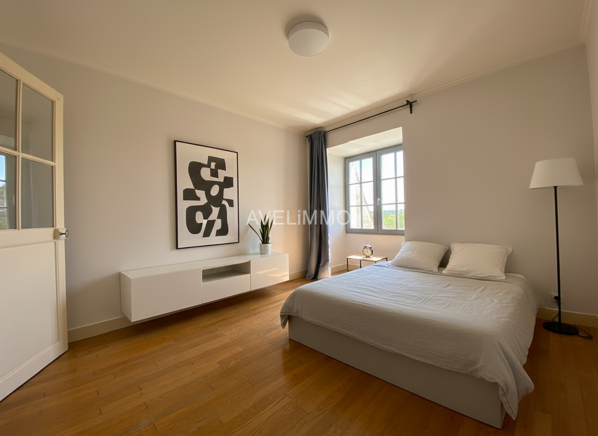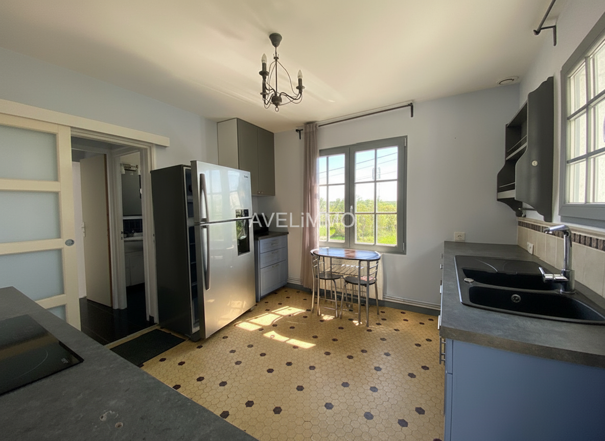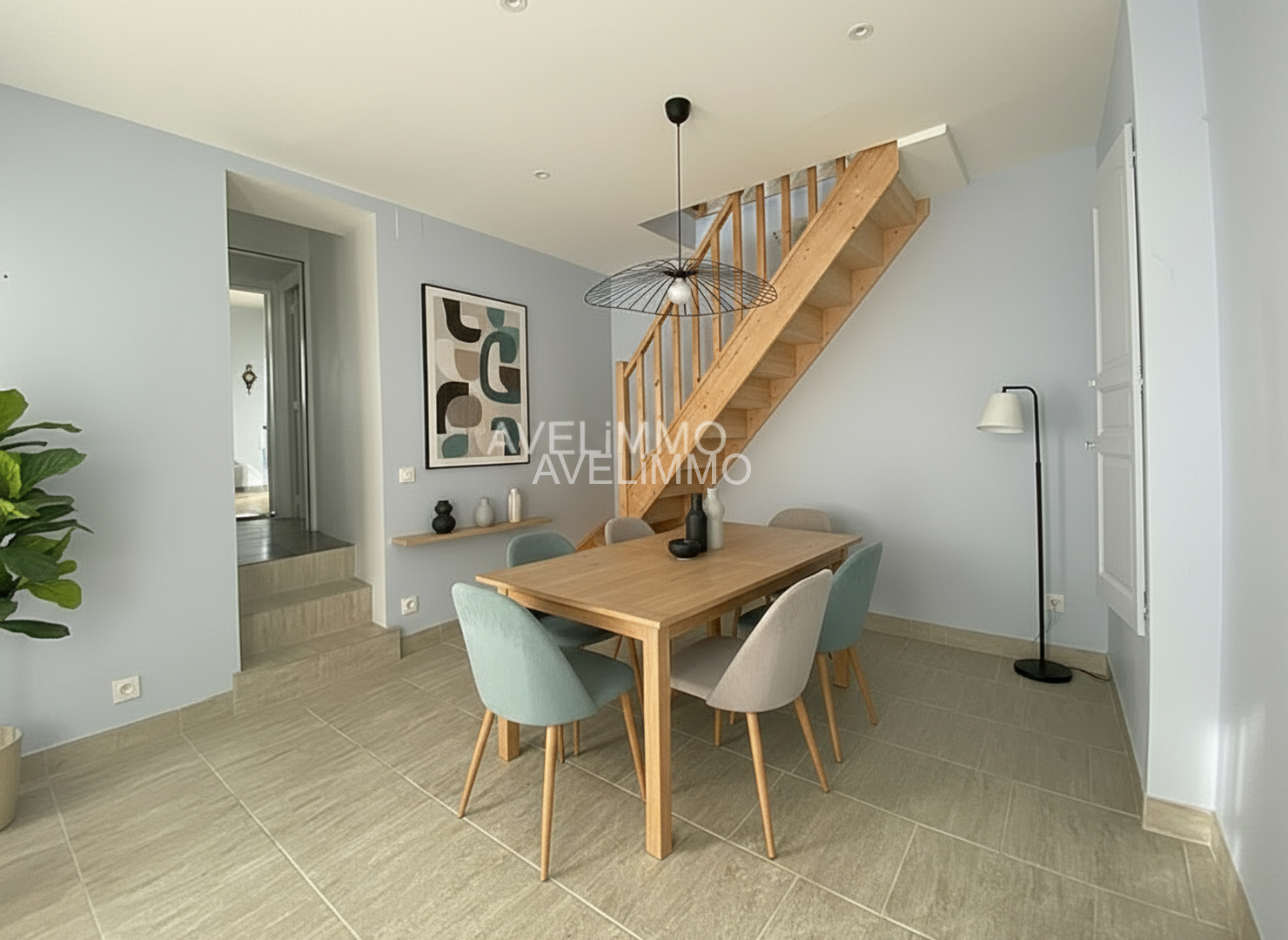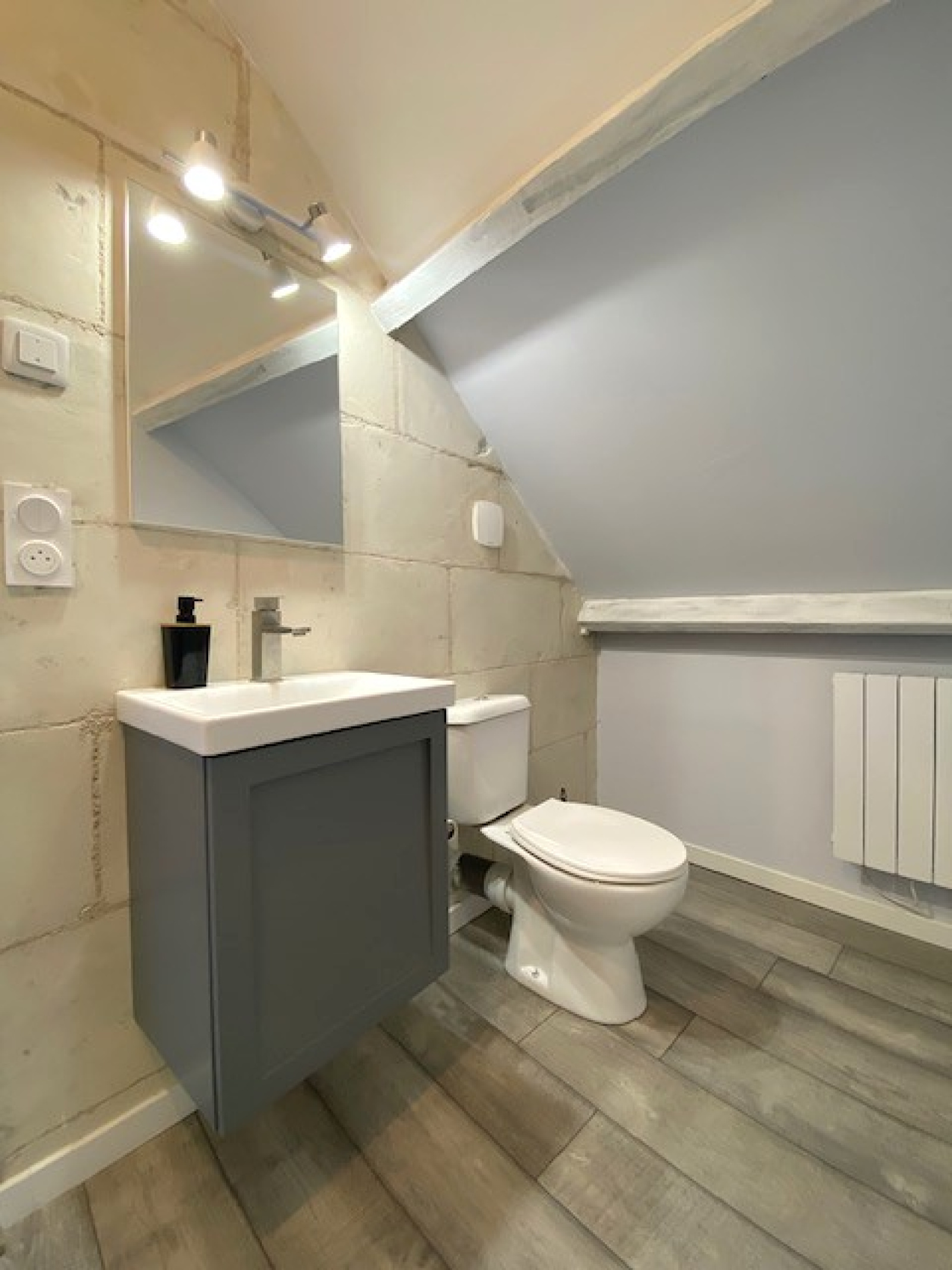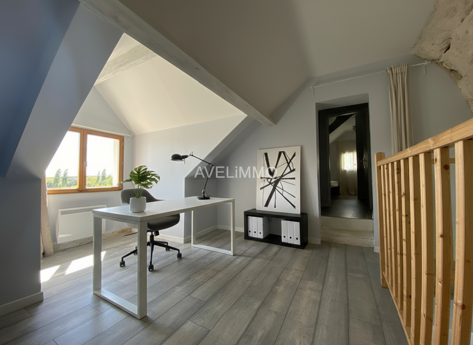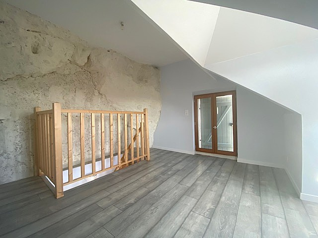Au rdc, une entrée desservant un salon avec cheminée insert, une cuisine aménagée et équipée, une salle à manger (ou chambre), une salle de bains, un wc séparé, une grande cave et une lingerie équipée dans le roc. A l'étage, desservi par deux escaliers conduisant chacun à un espace nuit : une grande chambre d'un côté et de l'autre côté, une pièce palière (bureau ou couchage d'appoint), un wc avec lave-mains (douche possible) et une chambre.