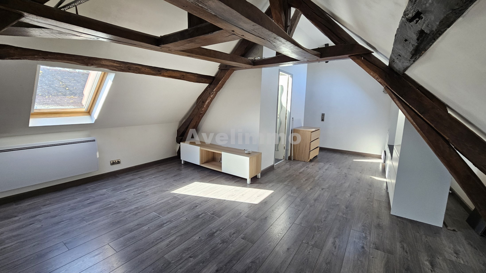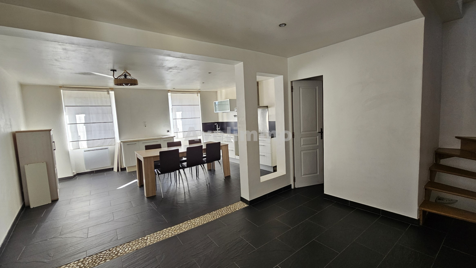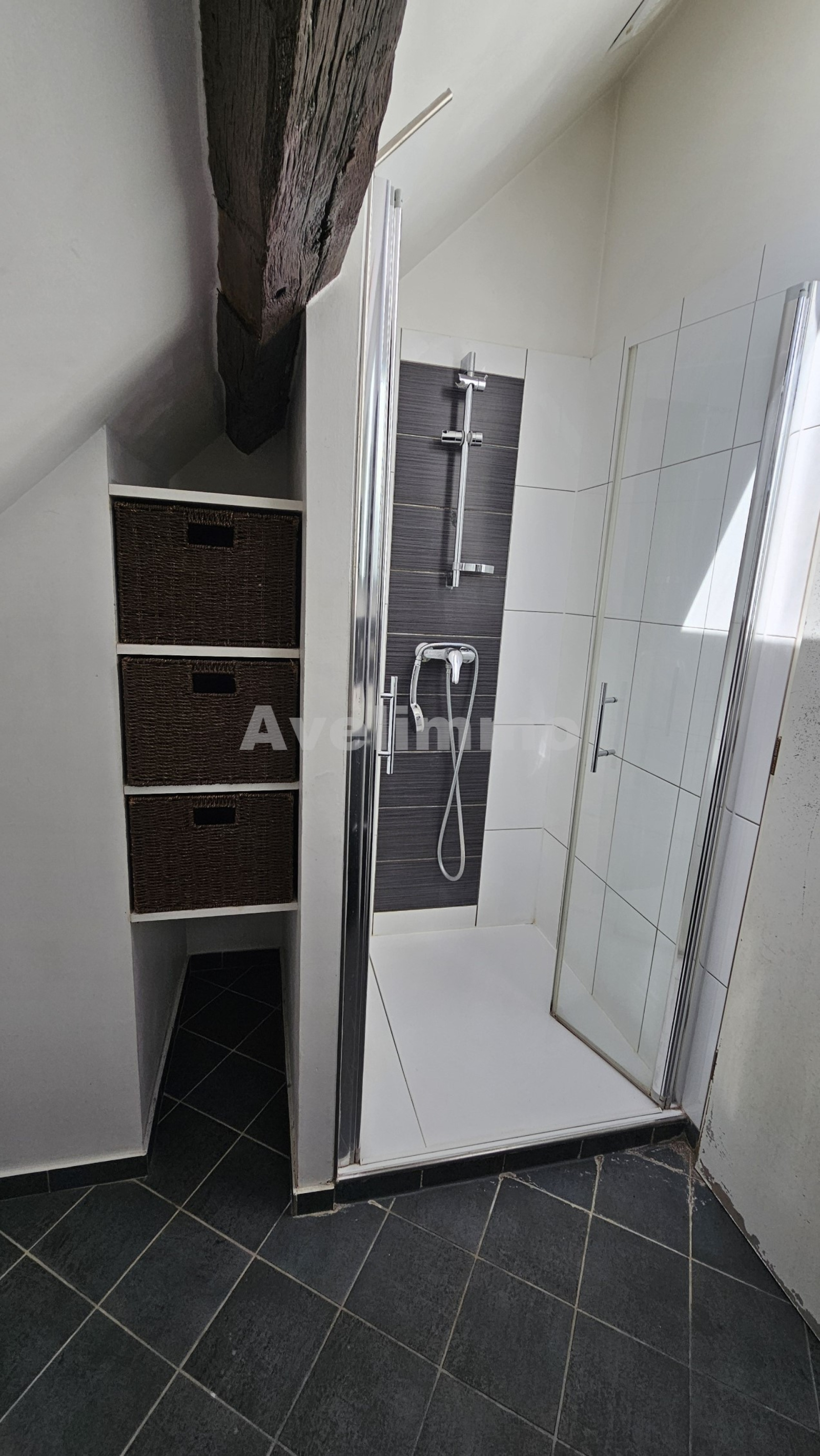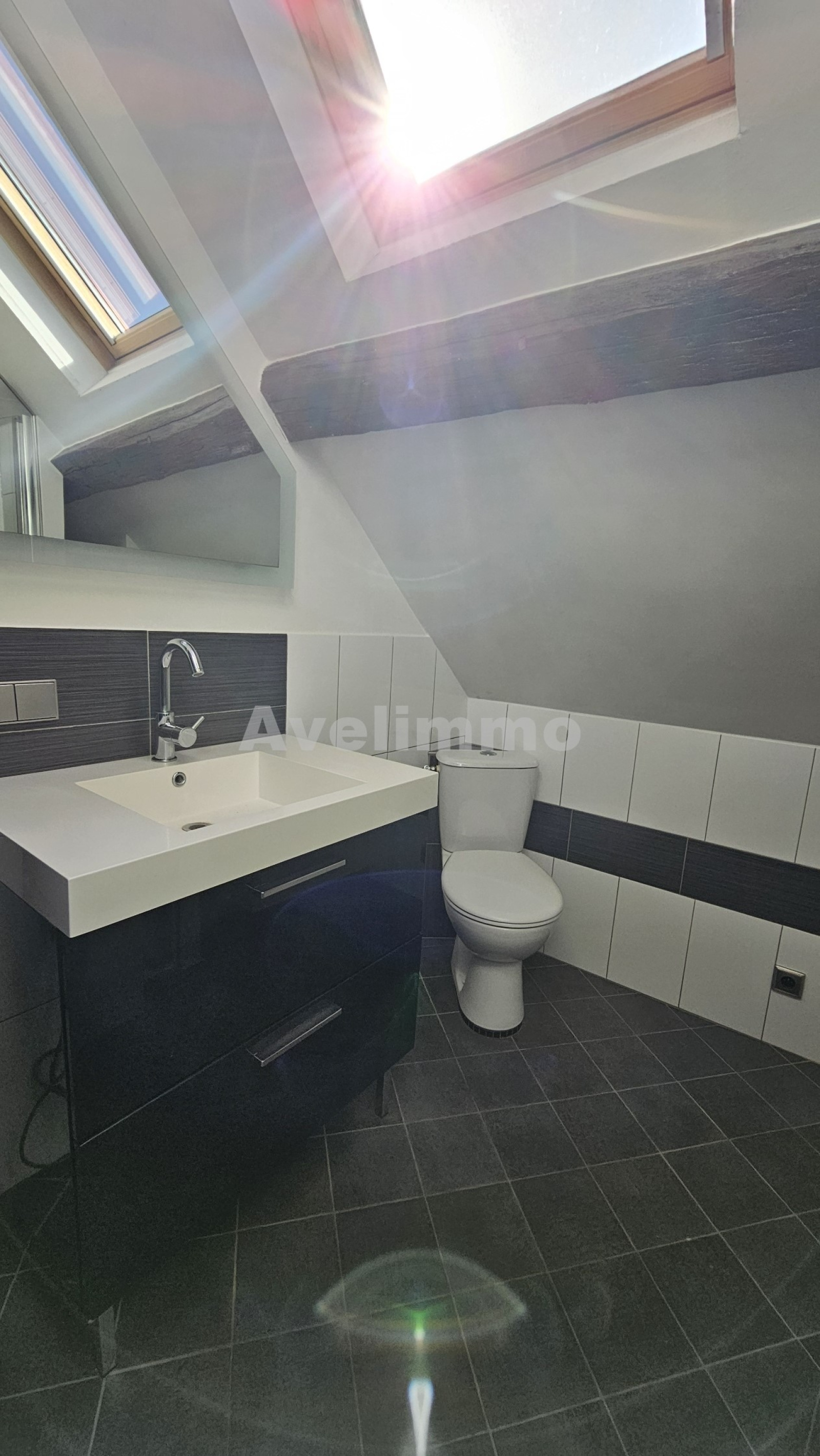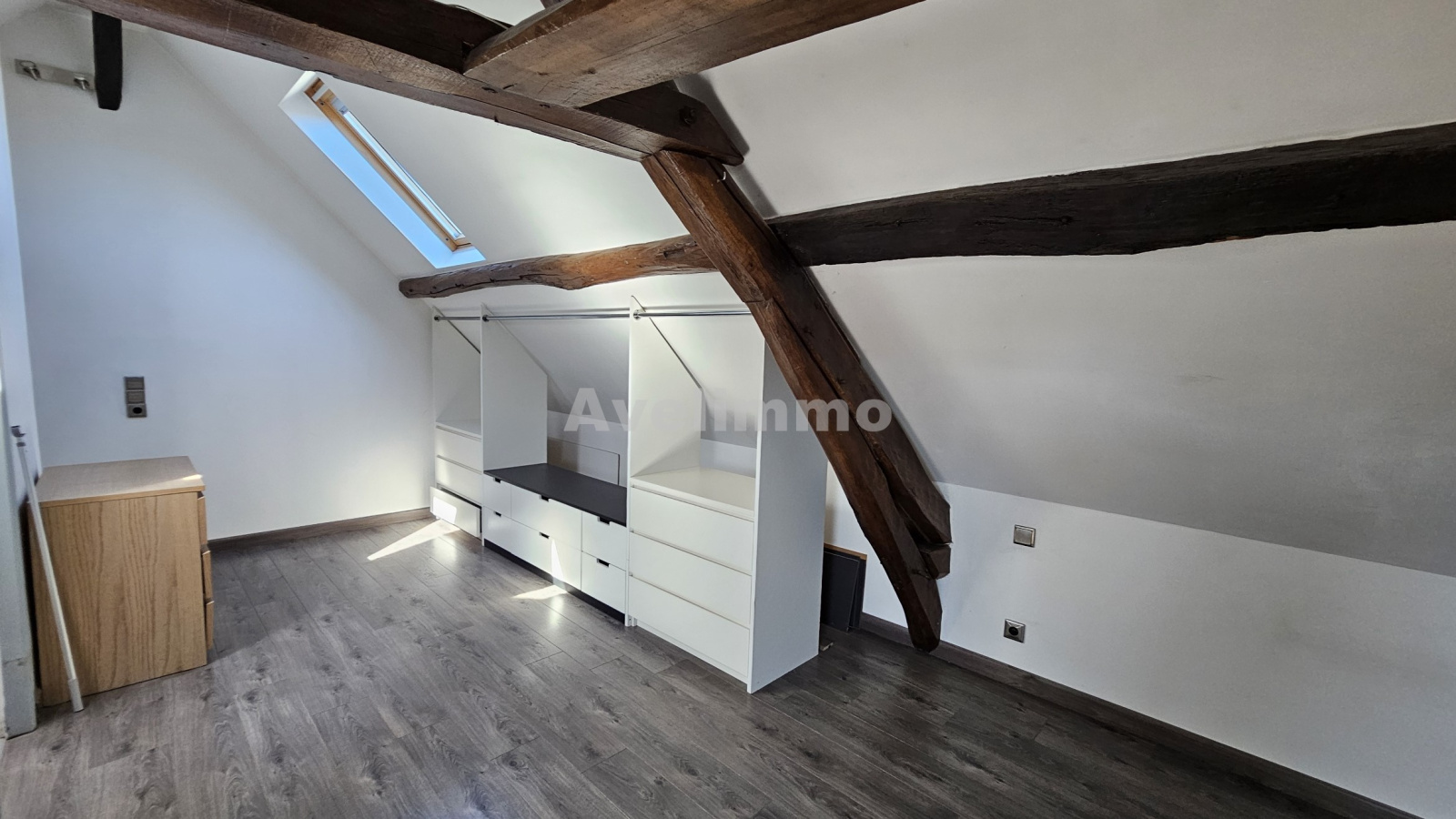 À l'étage, un duplex spacieux vous attend. Il se compose d'une pièce à vivre accueillante avec cuisine ouverte, d'un WC avec coin buanderie, et sous les combles, une grande chambre privative avec sa propre salle d'eau, WC et un dressing.