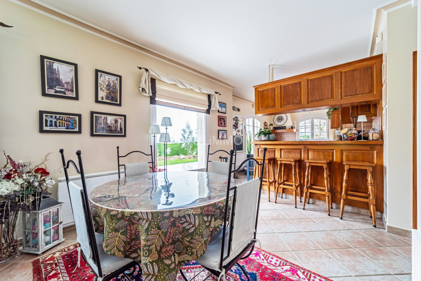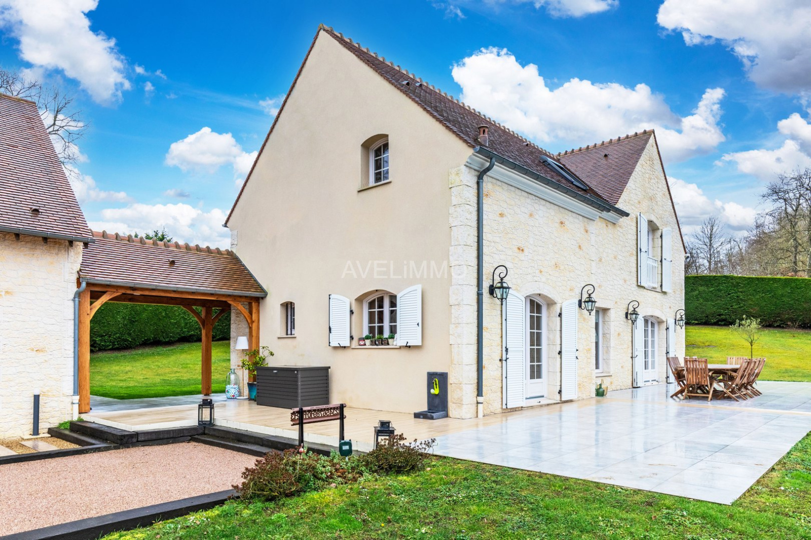 Le grand jardin arboré et clos est agrémenté d’une terrasse, d’un bassin décoratif, d’un terrain de pétanque et d’un garage.