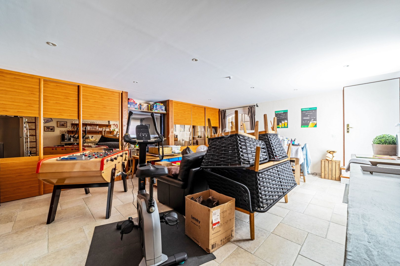 - Au rez-de-chaussée : une entrée avec vestibule, un salon séjour de 69 m² équipé d'une cheminée avec insert, une cuisine équipée, une buanderie et un WC indépendant.