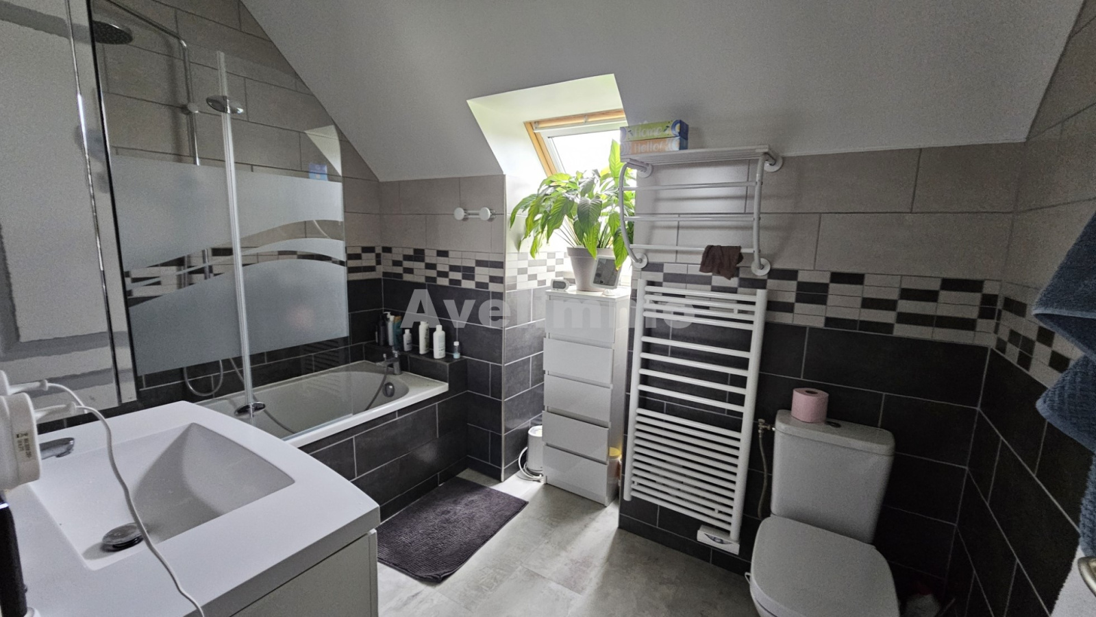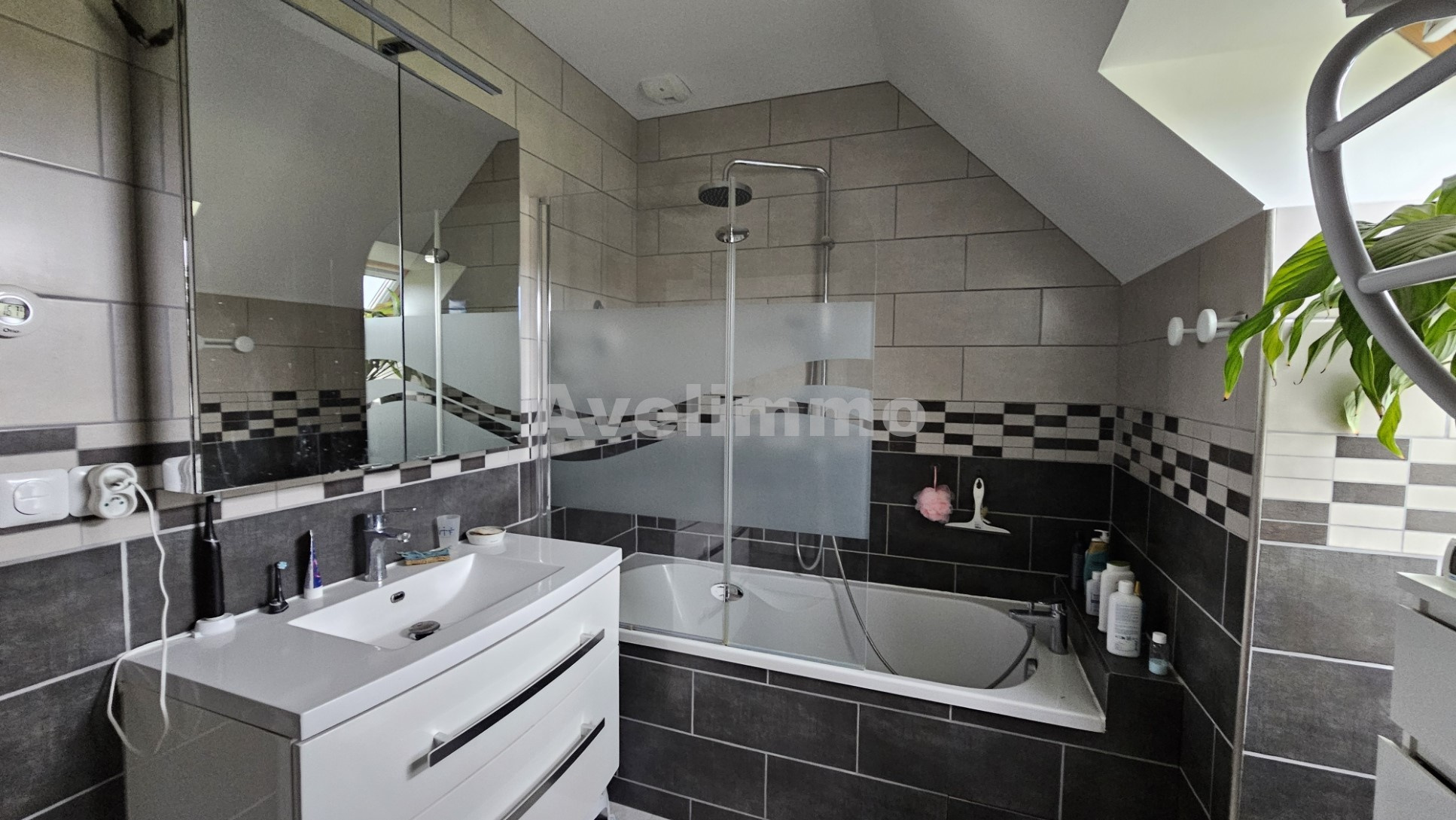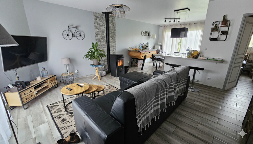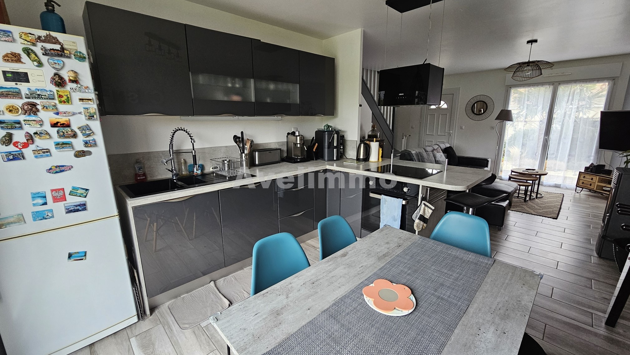 La cuisine ouverte, moderne et parfaitement équipée, s’intègre harmonieusement à la pièce de vie, offrant un espace fonctionnel et convivial. Le rez-de-chaussée comprend également une buanderie pratique, une chambre confortable et des toilettes indépendants.