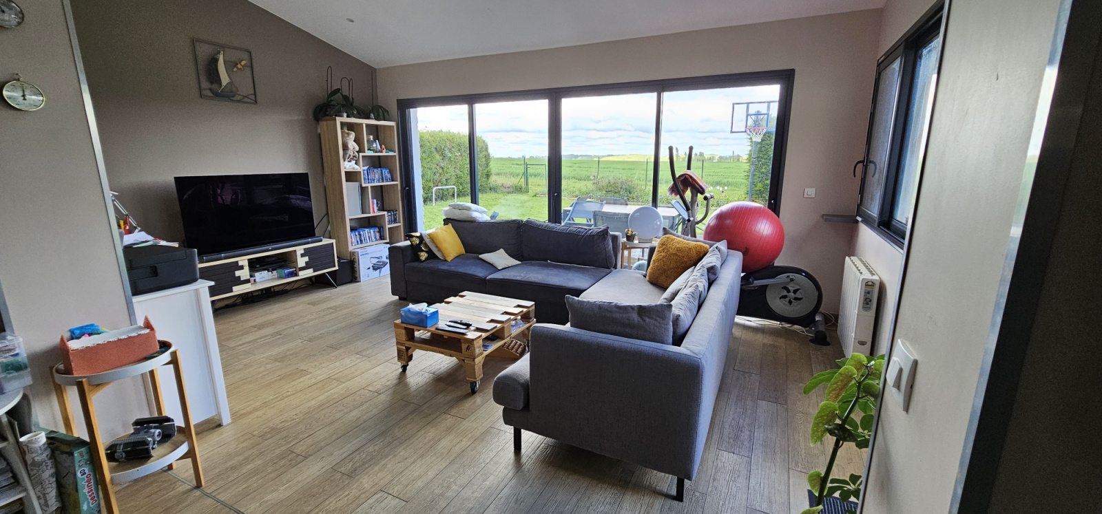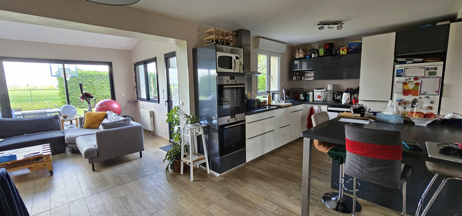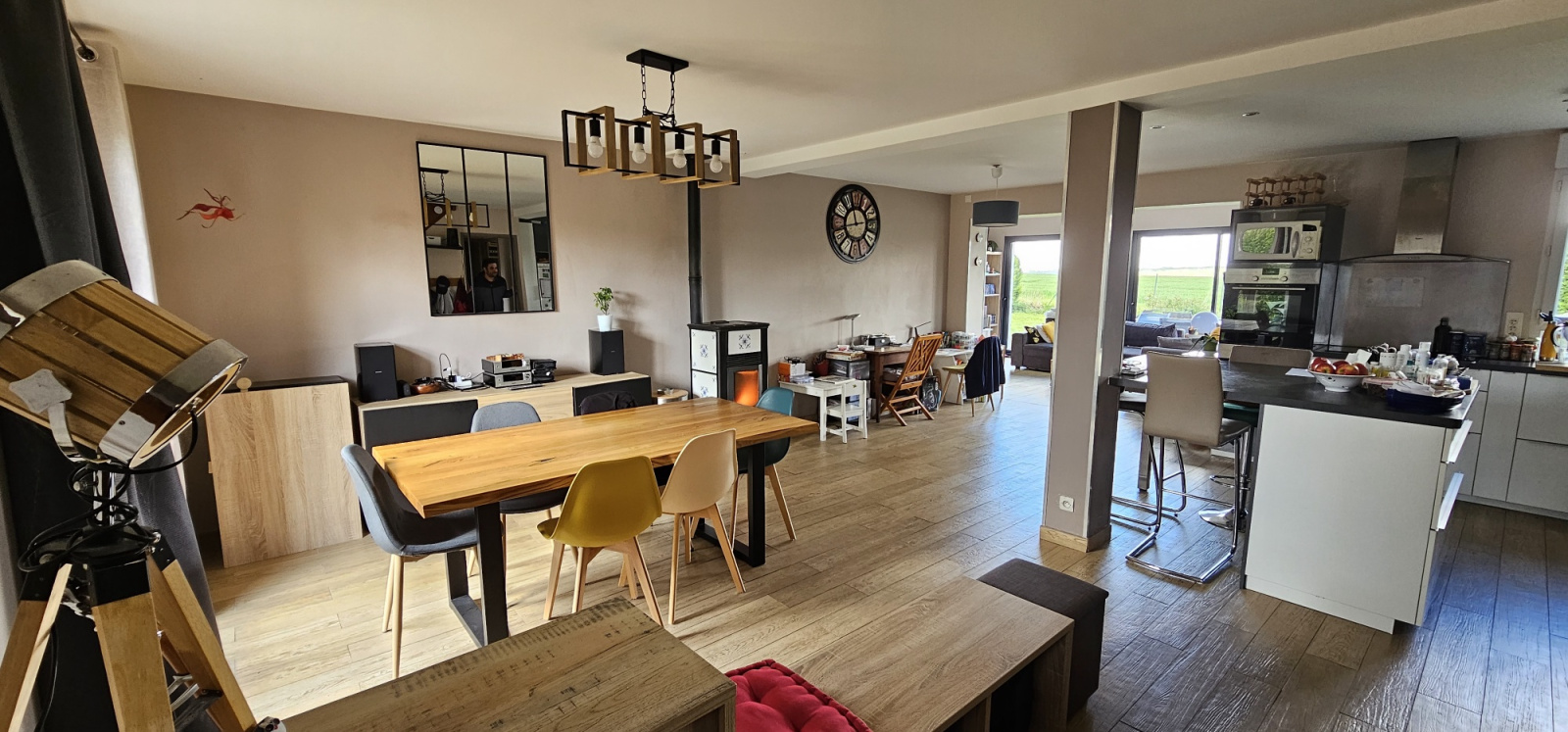 **Profitez du calme de la campagne dans cette charmante maison de 155 m², offrant une vue imprenable sur les environs et un cadre de vie paisible.** Au rez-de-chaussée, découvrez une spacieuse pièce à vivre de 63 m² avec une cuisine ouverte et équipée, une chambre avec placard, un bureau avec accès direct au garage, une salle de bains et un WC. À l'étage, quatre chambres vous attendent, dont une grande suite parentale et une chambre avec coin dressing, ainsi qu'une salle d'eau, un WC, et une mezzanine qui relie l'ensemble. En annexe, un grand garage double, un carport, un cabanon de jardin, et un jardin clos de 717 m² complètent ce bel ensemble, offrant un cadre de vie idyllique.