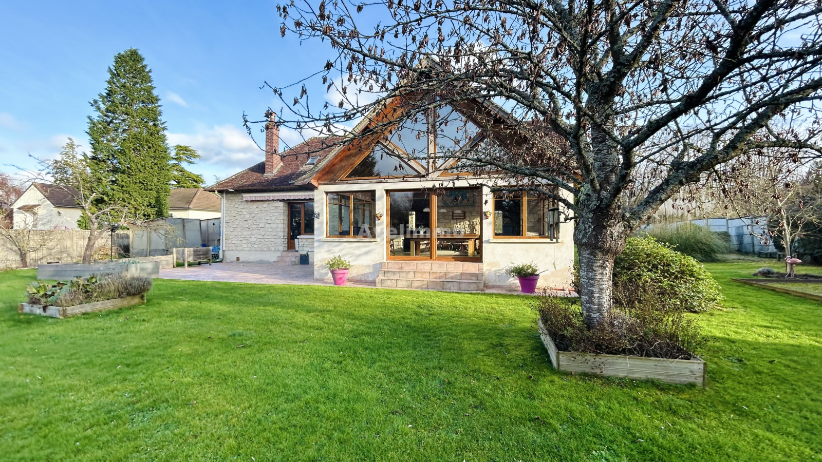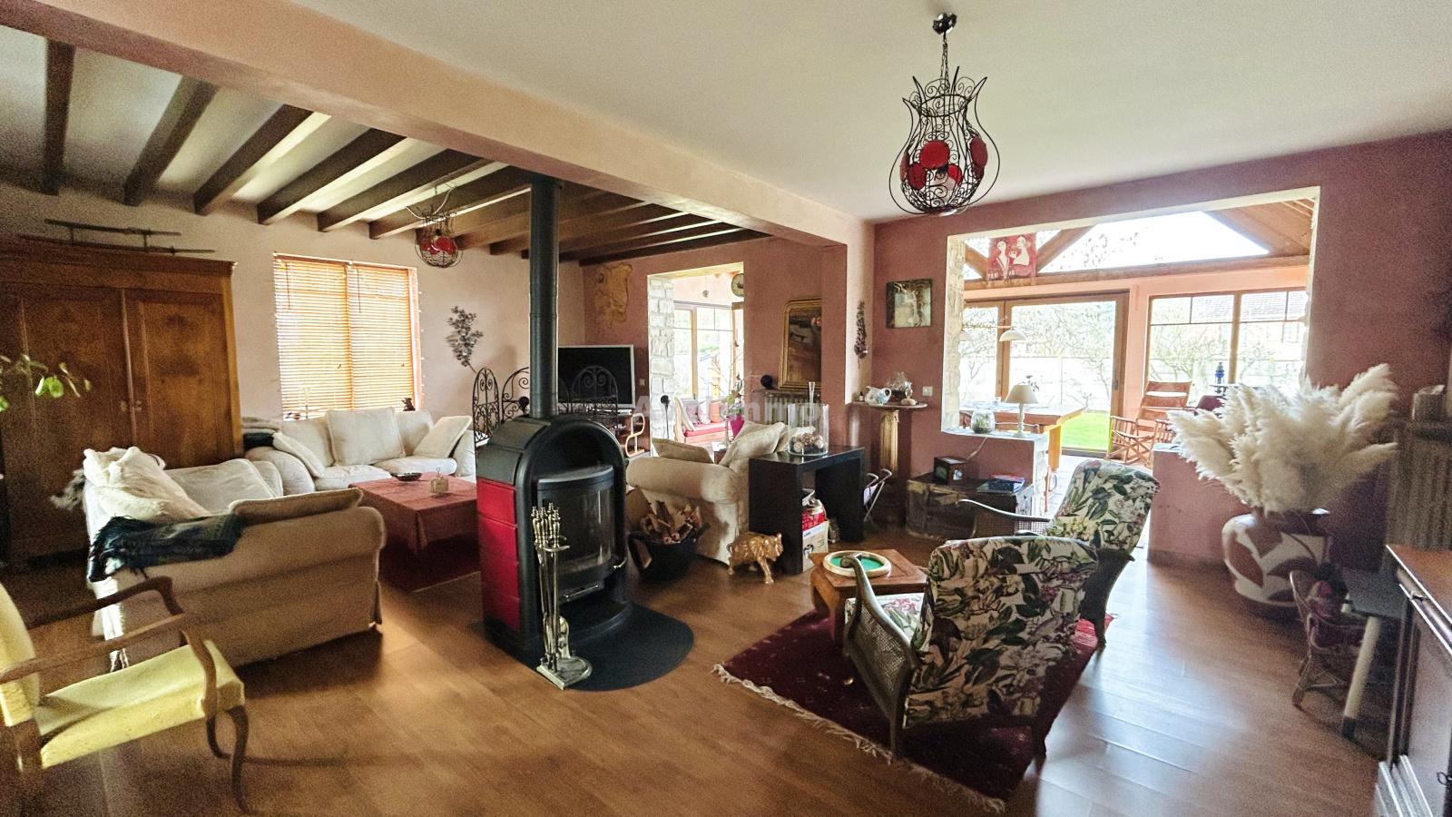 L’entrée s’ouvre sur une vaste terrasse carrelée de 48,50 m², surplombée d’une pergola bioclimatique, menant à un séjour lumineux et chaleureux agrémenté d’un poêle à bois, prolongé par une véranda maçonnée de style cathédrale aux volumes impressionnants.