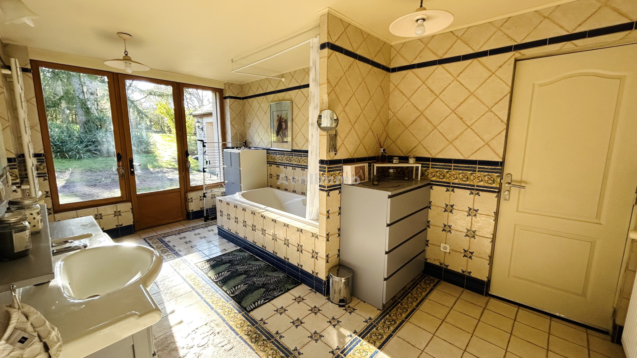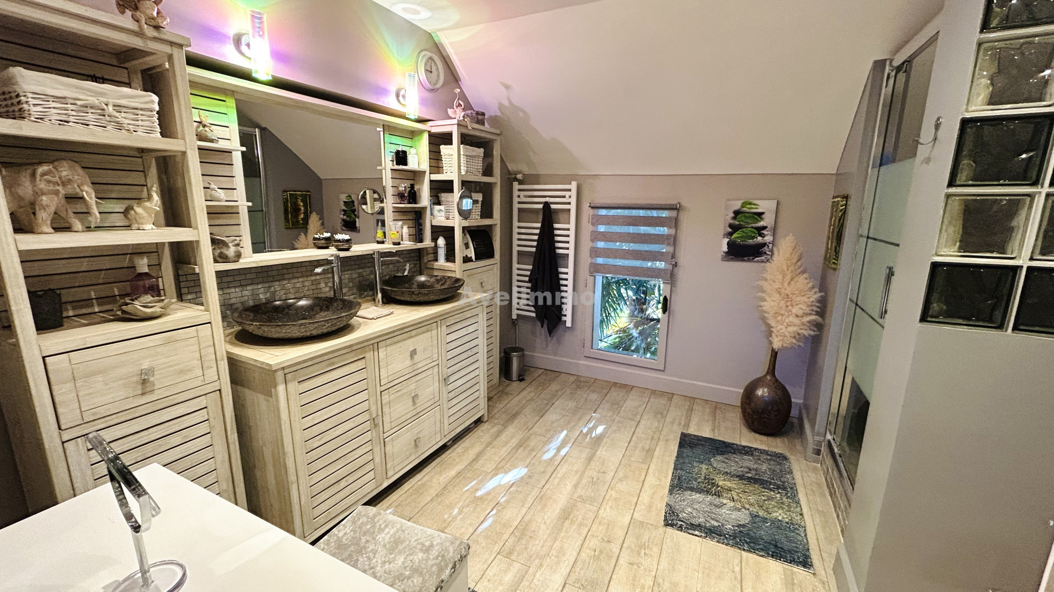 À l’étage, une superbe chambre de 35m², lumineuse et pleine de charme, s’accompagne d’une cinquième chambre avec dressing et salle de jeux attenante, ainsi que d’une salle d’eau avec WC.