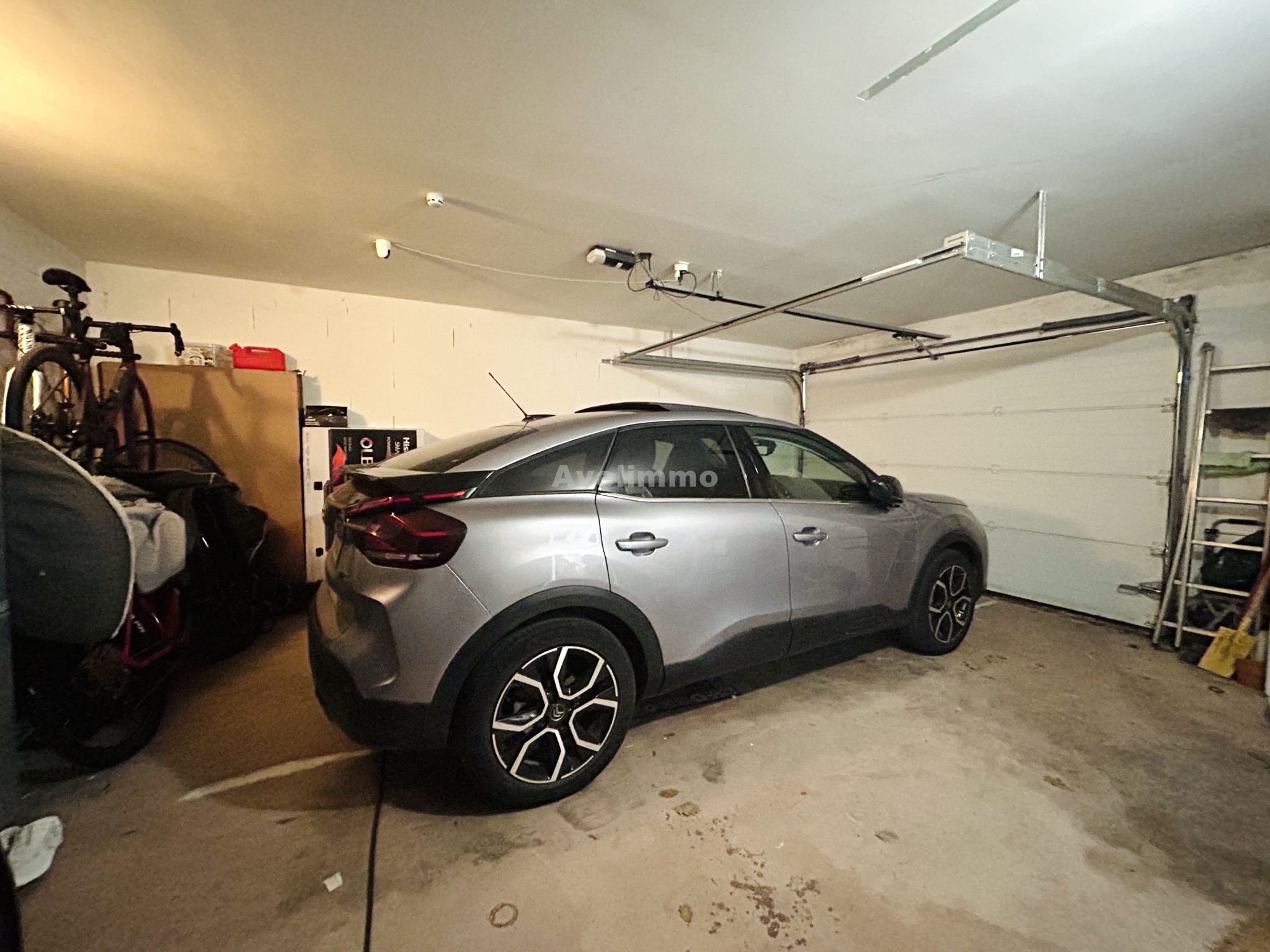 Un grand garage de 32 m² avec porte automatique et une buanderie.